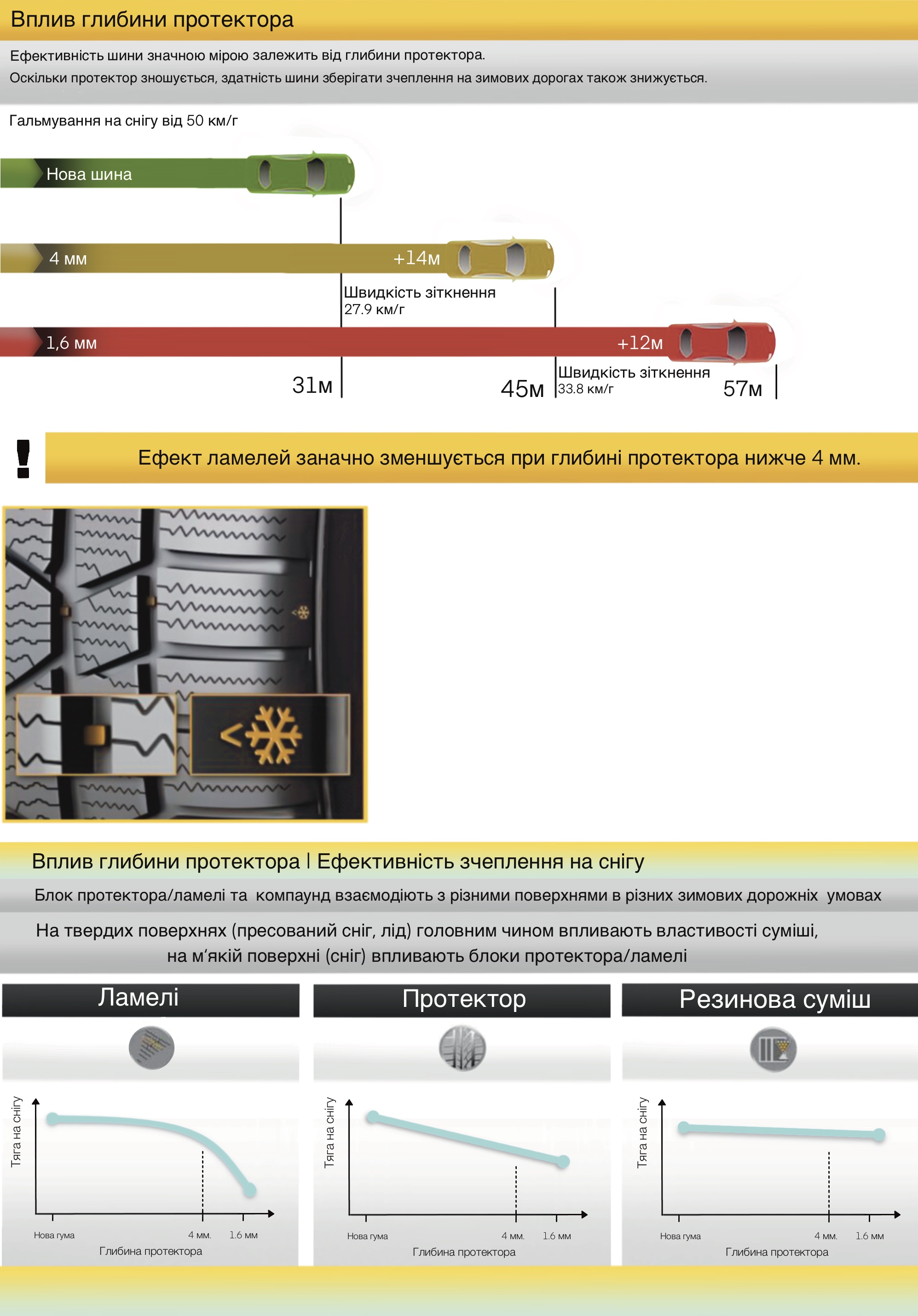 Більш того, роль протектора стає ще більш значущою для зимових шин. Порівняння показує, що якщо нова шина може одразу зупинитися на снігу, то напівзношена може продовжувати рухатися зі швидкістю понад 27 км/год, а для повної зупинки їй потрібно ще 14 метрів. А повністю зношена - ще плюс 12 метрів!